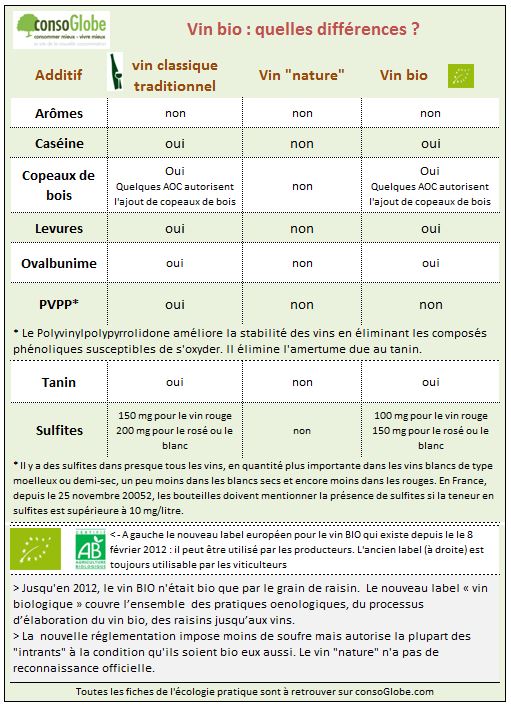 En observant le tableau de comparaison des vins je découvre qu’il y a du vin bio et du vin « naturel » qui lui ne reçoit aucun additif… Il m’a donc l’air plus sain que le vin « bio »…Non ? Quel logo permet de reconnaître ce vin ? Et est-ce que le raisin qui sert à fabriquer ce vin « naturel » est traité chimiquement comme un vin ordinaire ?